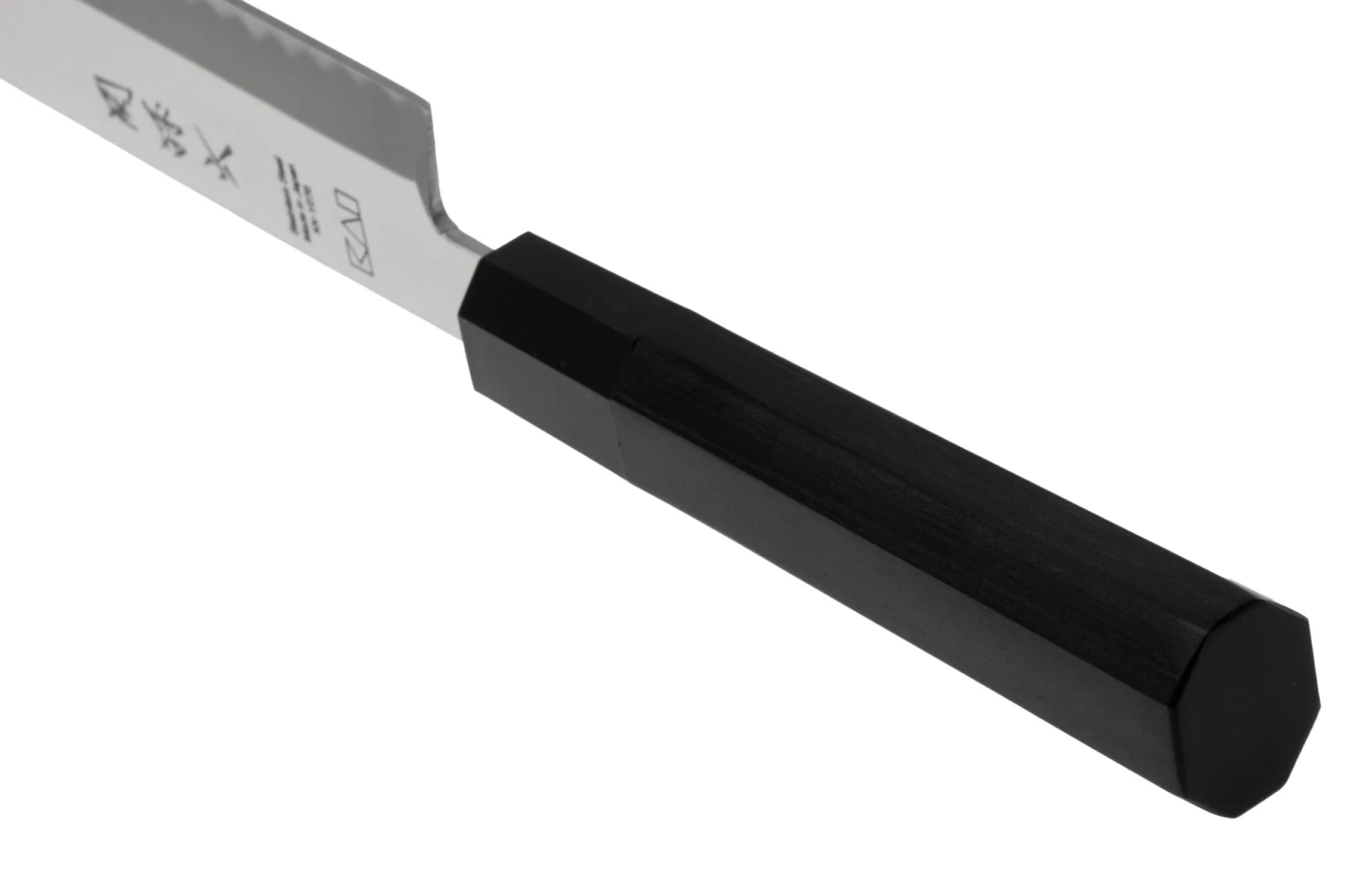El cuchillo Kai Seki Magoroku KK Yanagiba, de 27 centímetros de longitud, es perfecto para cortar en rodajas finas y preparar el pescado. El cuchillo de sashimi japonés está hecho de acero inoxidable con carbono, que se mantiene afilado durante mucho tiempo. Gracias a su diseño sencillo pero elegante, este cuchillo será un buen complemento para tu cocina.