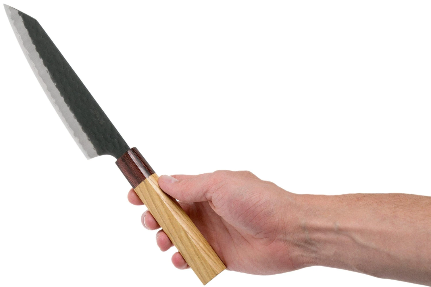 Este cuchillo Sakai Takayuki kengata 16 cm de la colección Blue Super tiene una hoja kengata. Significa ‘parecido a una espada’ y se refiere a la forma de la hoja que se inclina bruscamente en la punta. Aparte de eso, el cuchillo puede considerarse un miembro de la familia santoku. Con la punta estrecha puedes cortar finamente carne, pescado y verduras.