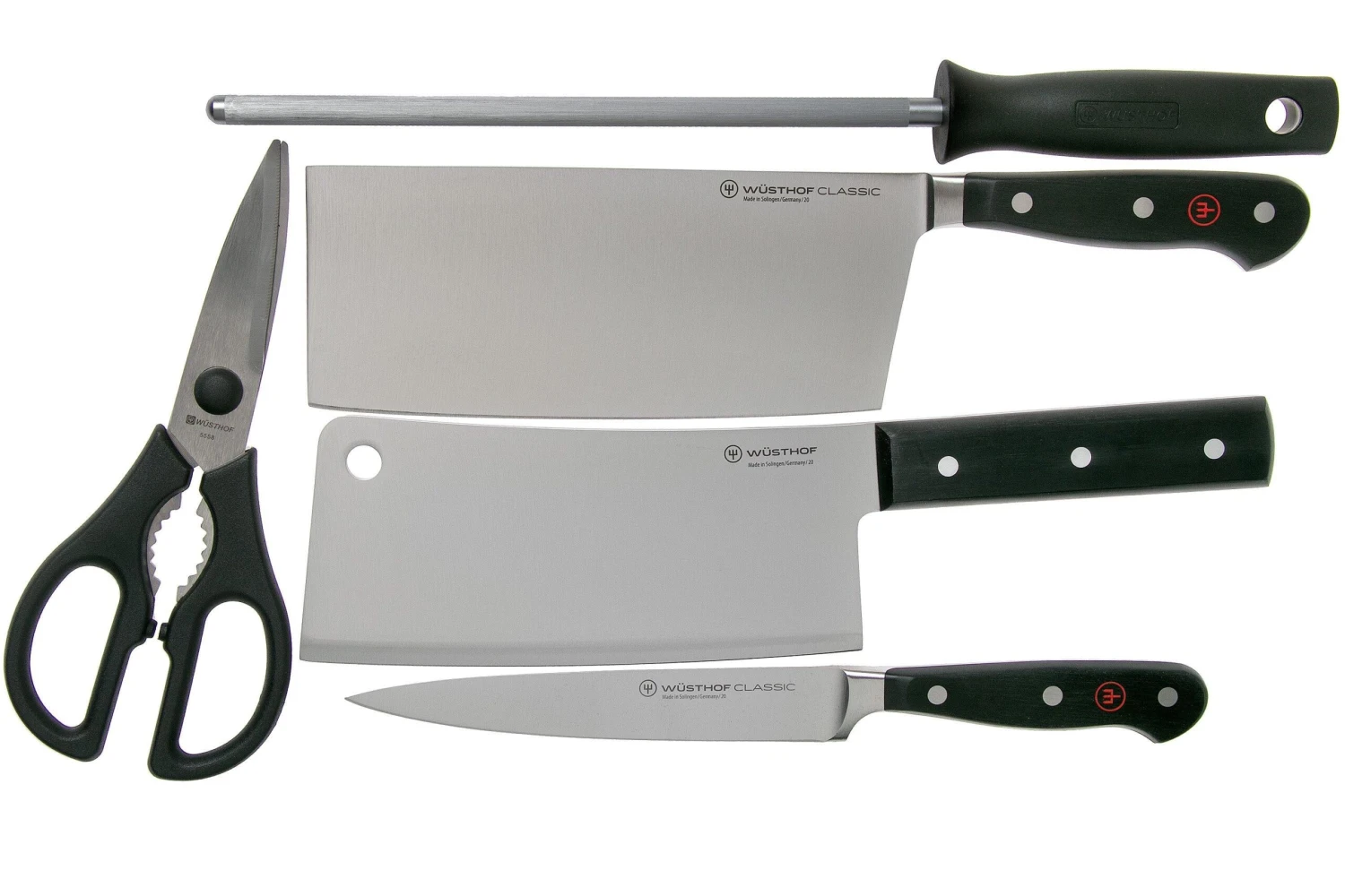Este juego de cuchillos Wüsthof Classic de 5 piezas es único gracias a sus notables cuchillos. El juego se compone de tres cuchillos, una chaira y unas tijeras. Puede que los dos cuchillos grandes no se parezcan, pero ambos tienen una función diferente.